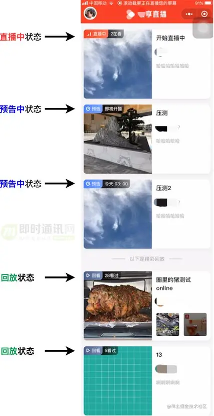 这样,每个直播场次就有三种状态——预告中(创建一场直播但还未开播)、直播中、回放。