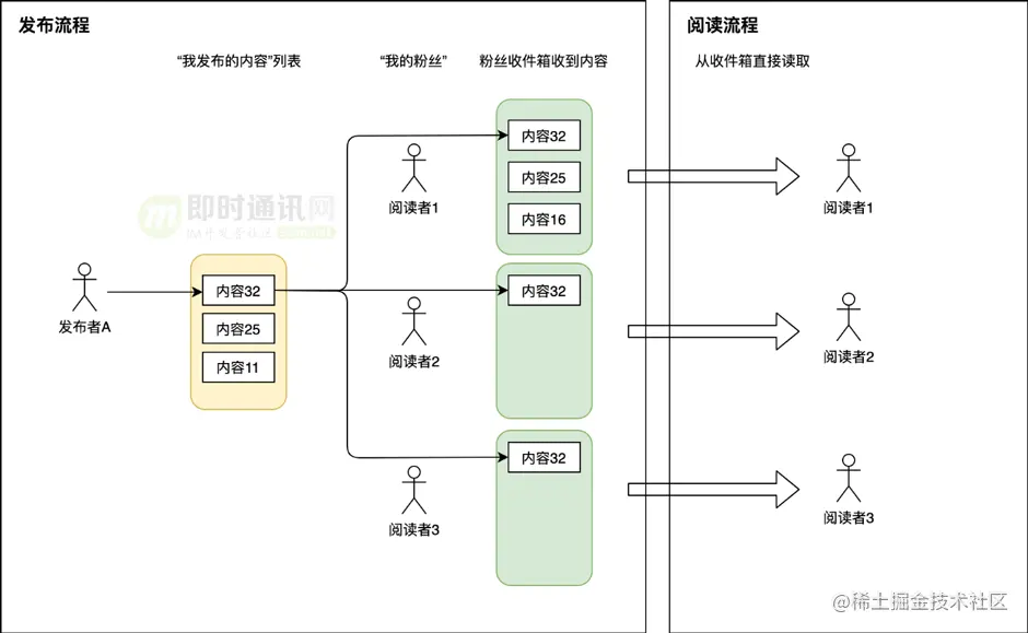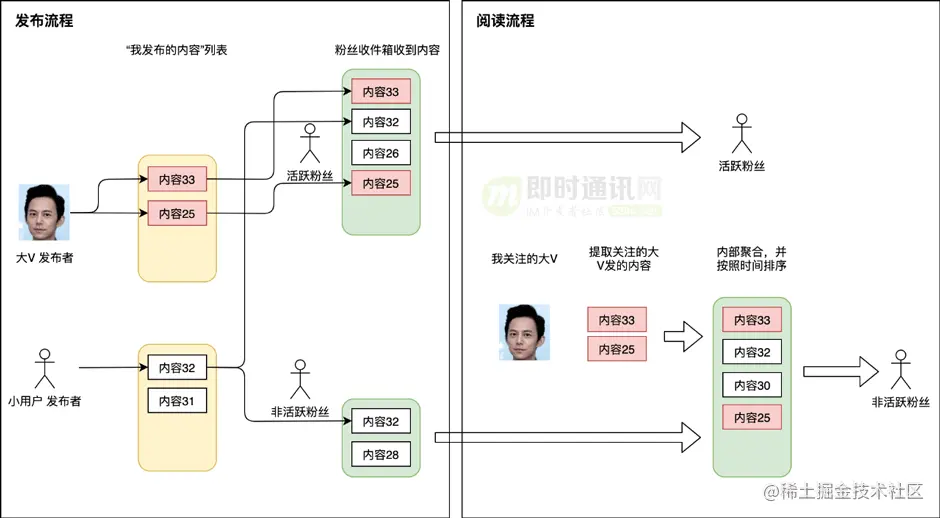 如上图所示: 系统中每个用户除了有发件箱,也会有自己的收件箱。当发布者发表一篇帖子的时候,除了往自己发件箱记录一下之外,还会遍历发布者的所有粉丝,往这些粉丝的收件箱也投放一份相同内容。这样阅读者来读Feed流时,直接从自己的收件箱读取即可。
