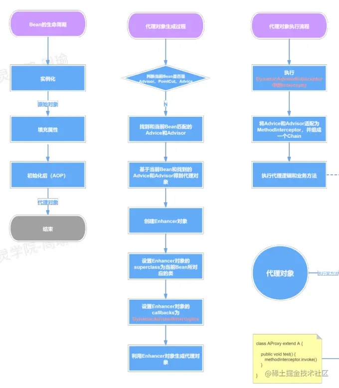Spring在创建⼀个Bean的过程中,⾸先会实例化得到⼀个对象,然后再利⽤Bean后置处理器来对该实例对象进⾏加⼯,⽐如我们常说的依赖注⼊就是基于⼀个Bean后置处理器来实现的,通过该Bean后置处理器来给实例对象中加了@Autowired注解的属性⾃动赋值,还⽐如我们常说的AOP,也是利⽤⼀个Bean后置处理器来实现的,基于原实例对象,判断是否需要进⾏AOP,如果需要,那么就基于原实例对象进⾏动态代理,⽣成⼀个代理对象。