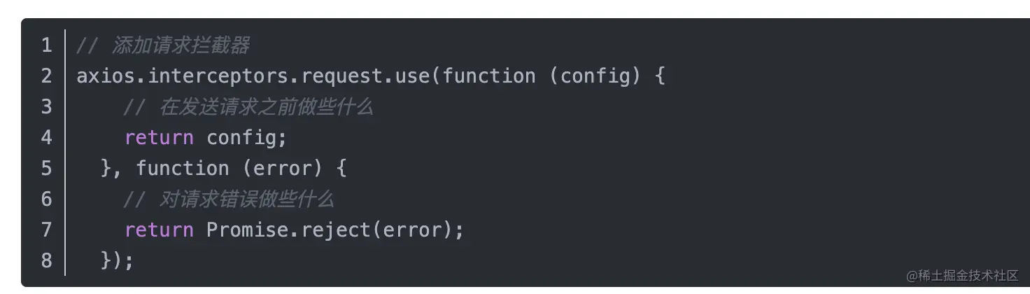 一个axios实例上有两个拦截器,一个是请求拦截器, 然后响应拦截器。我们下看下官网的用法: