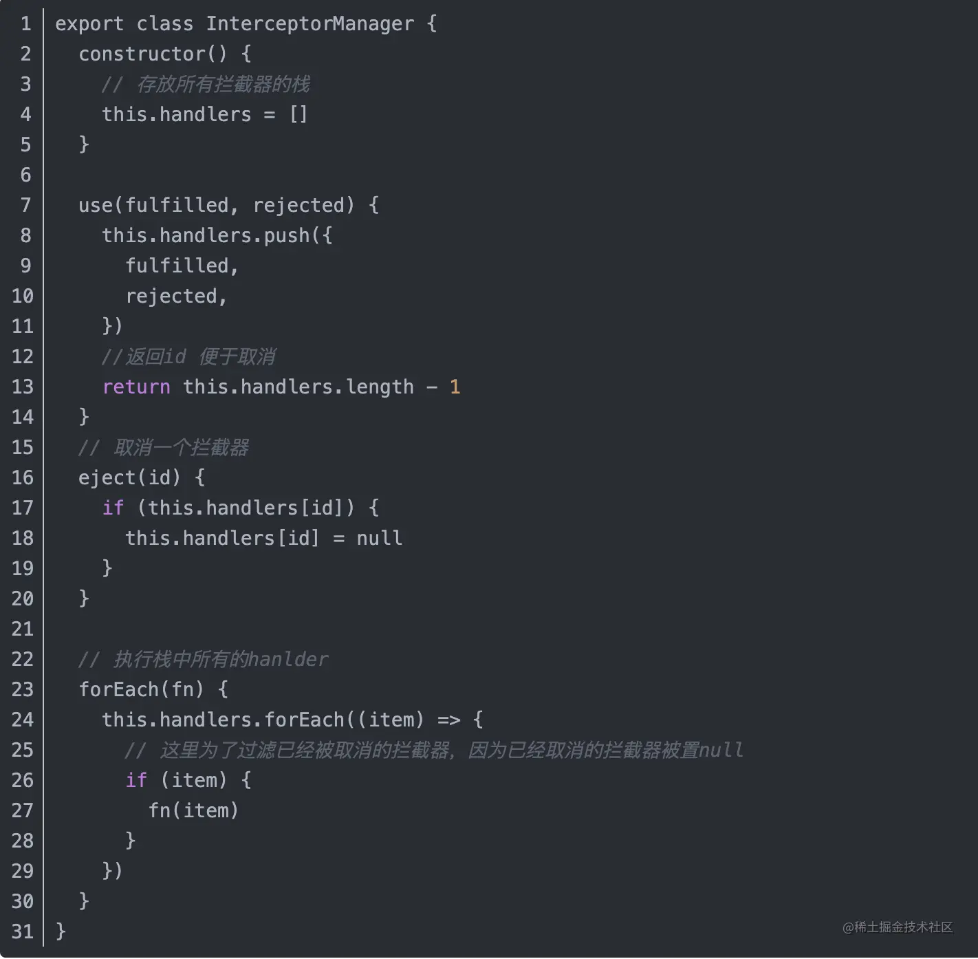 其实源码中就是,所有拦截器的执行 所以说肯定有一个forEach方法。