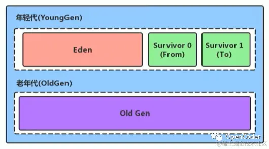 Java堆区进一步细分的话,可以划分为年轻代(YoungGen)和老年代(oldGen),其中年轻代又可以划分为Eden空间、Survivor0空间和Survivor1空间(有时也叫做from区、to区)。