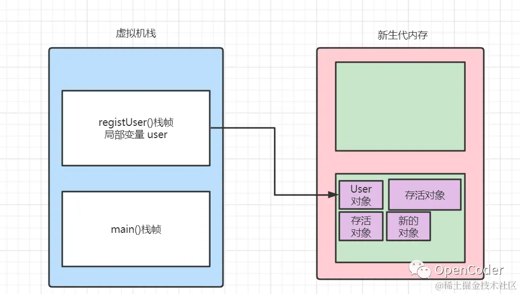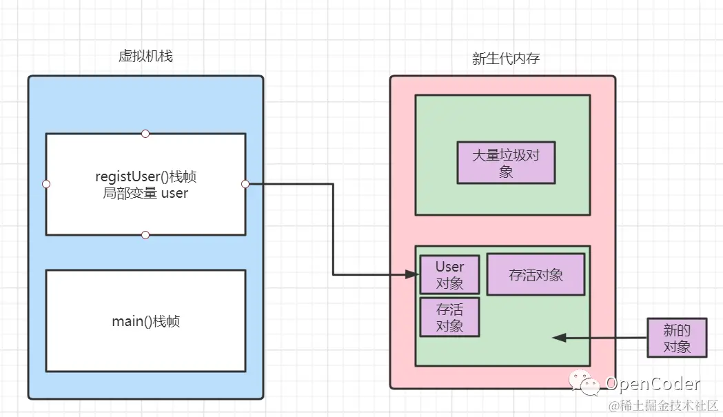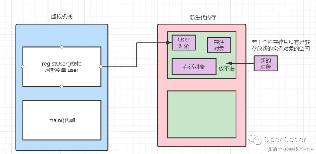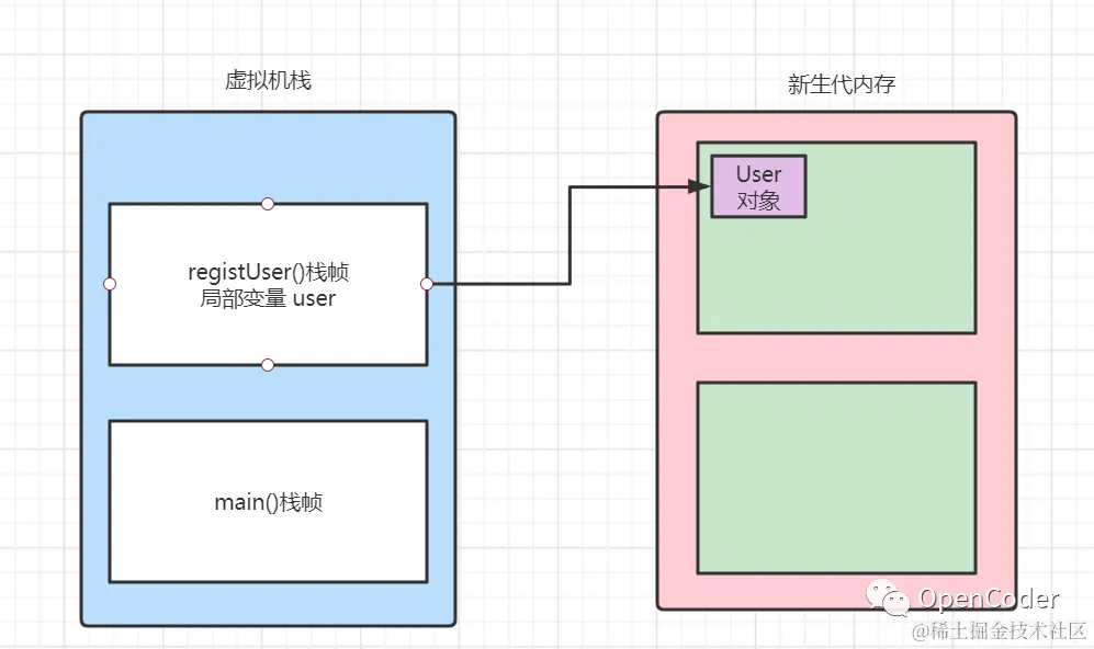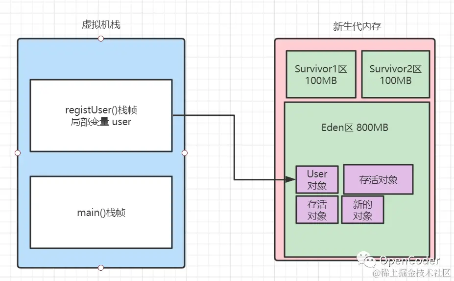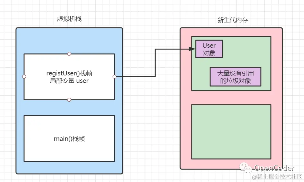 那么如果我们假设我们的程序不停止,依然在运行,这时不停的调用registUser()方法生产大量的User对象,对应栈帧已经退出,没有指向对应的对象,那么就会在堆内存中产生大量的垃圾对象: