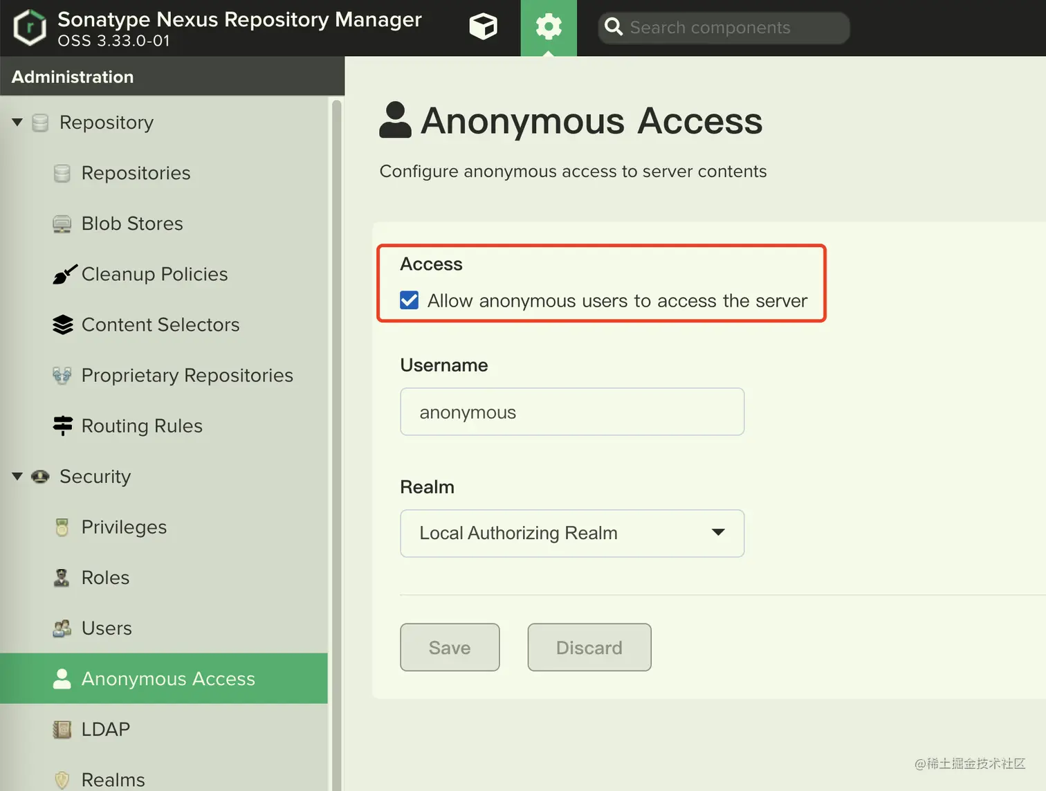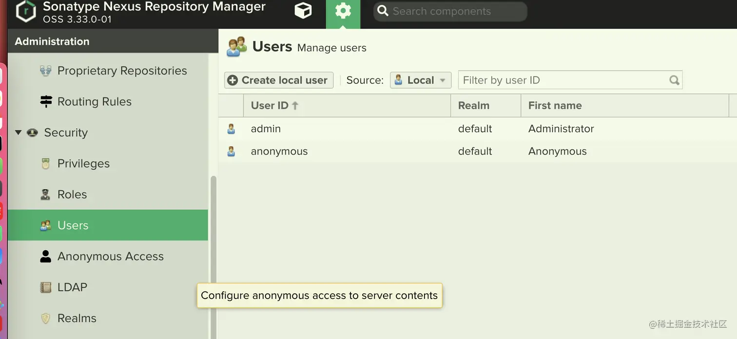 anonymous:匿名用户,我们不提供账号密码的时候默认使用的就是这个匿名账号,该账号只能拉取。也可以在这设置中关闭匿名用户,让我们的私服的任何操作必须登录