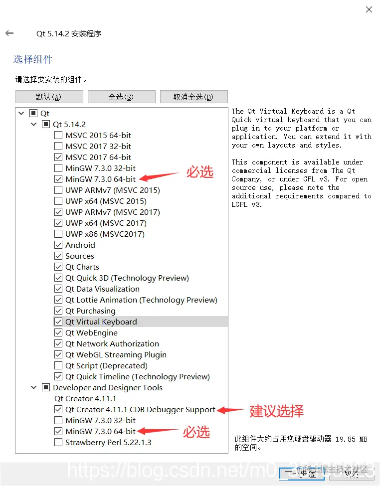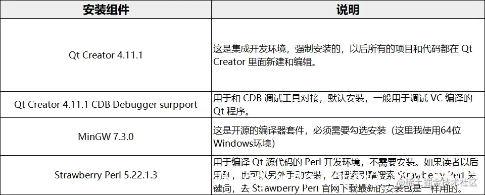 Qt 的安装组件分为两部分:一部分是“Qt 5.14.2”分类下的,该分类包含的是真正的 Qt 开发库组件,说明如下所示: