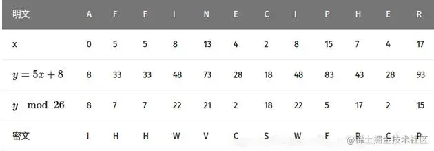 单表加密的一种,字母表的每个字母相应的值使用一个简单的数学函数对应一个数值,再把对应数值转换成字母。