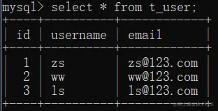 insert into t_user(id,username,email) values(1,'zs','zs@123.com'); insert into t_user(id,username,email) values(3,'ls','ls@123.com'); insert into t_user(id,username,email) values(2,'ww','ww@123.com');