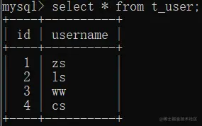 insert into t_user(id,username) values(1,'zs'); insert into t_user(id,username) values(2,'ls'); insert into t_user(id,username) values(3,'ww'); insert into t_user(id,username) values(4,'cs');