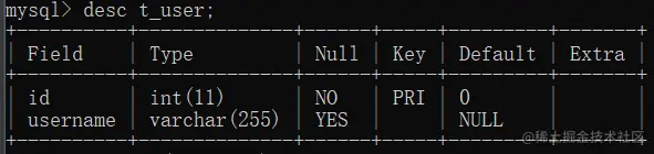 注意 : id此时为主键,所以NULL不能为YES,key字段为PRI,代表为主键。