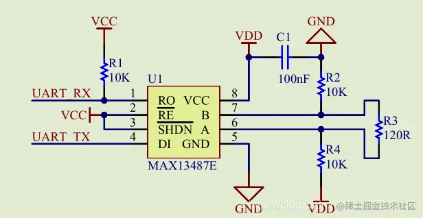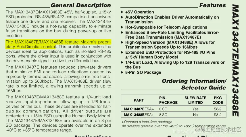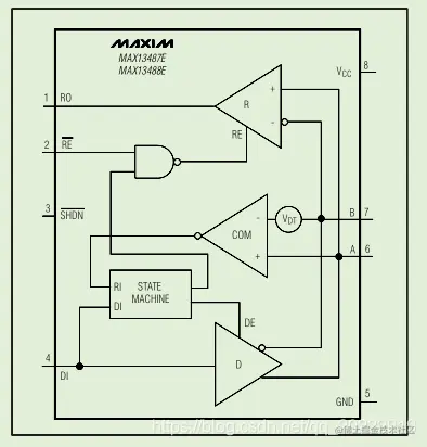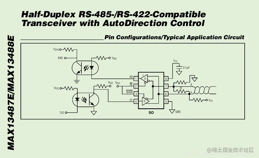 网上查找资料后发现485的自动收发硬件电路有很多,通过外部搭建的模拟电路就可以实现接收和发送数据的自动切换,这种电路的器件参数和稳定性可靠性都要根据使用环境去测试,使用起来比较麻烦。查找资料后发现MAX13487E这个芯片自带了接收和发送自动切换功能。现在看一下这个芯片的使用方法。