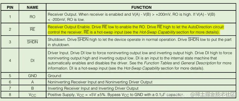 通过引脚功能可以看到,2脚为低电平时为接收功能,2脚为高电平时为自动方向控制功能。3脚为高电平时为正常操作模式,3脚为低电平时为关断模式。将2脚和3脚都接高电平时,就能实现自动收发数据自动切换了。