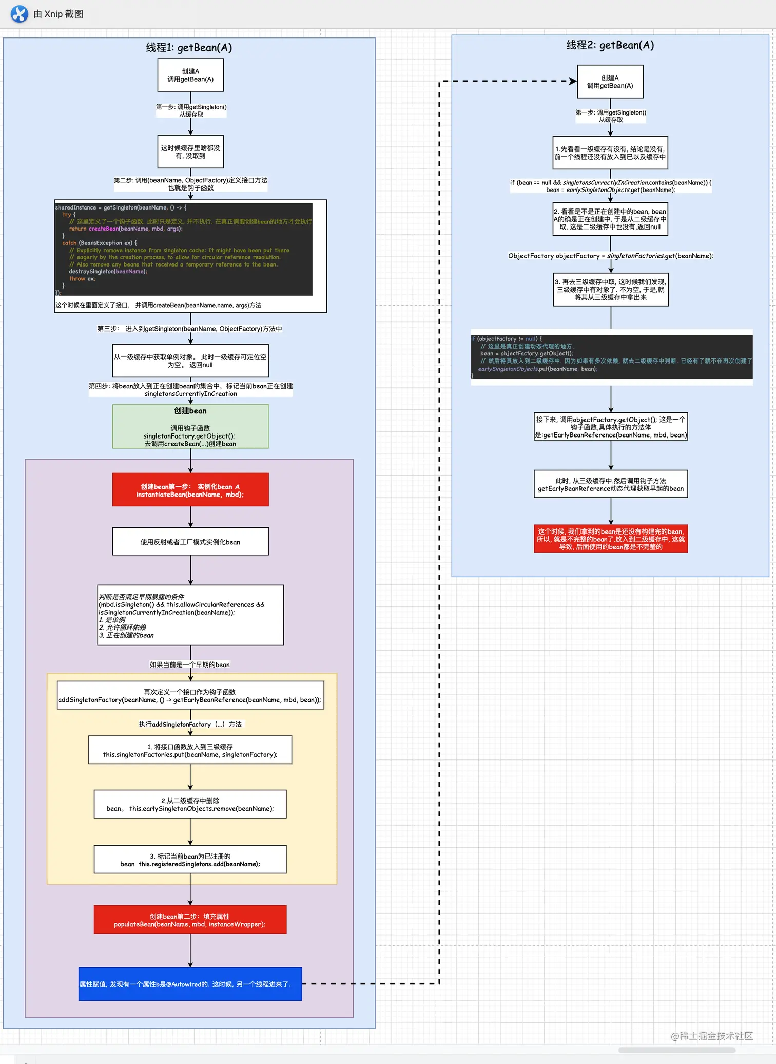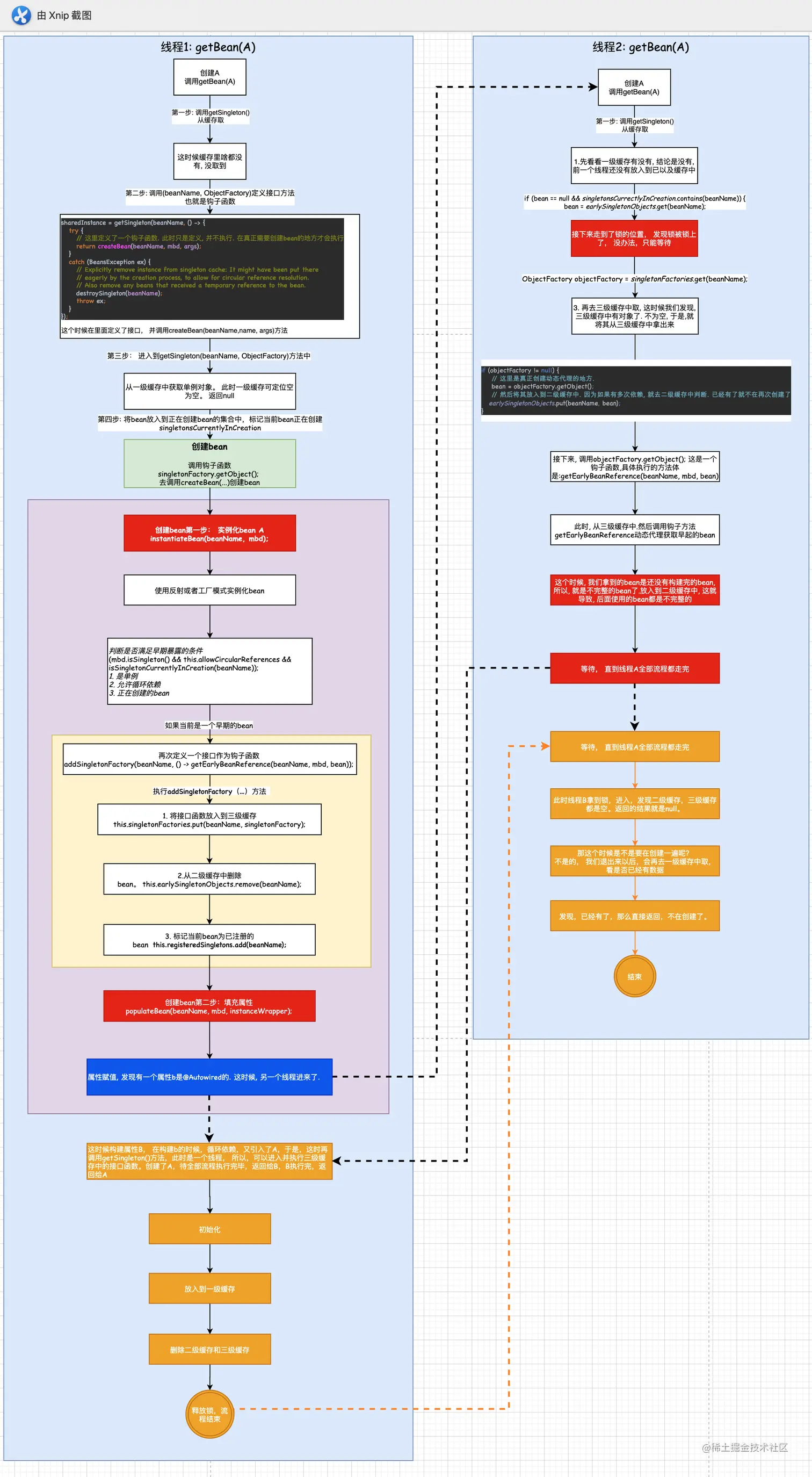 如上图,线程B执行到getSingleton()的时候, 从一级缓存中取没有, 到二级缓存的时候就加锁了,他要等待直到线程A完成执行完才能进入. 这样就避免出现不完整bean的情况.