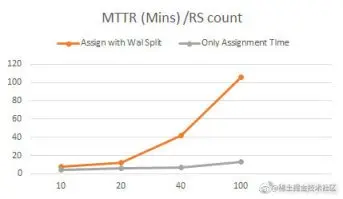 在 10 到 100 个节点的集群测试中,我们观察到恢复时间随着集群规模的增大而线性增加。这意味着集群越大,恢复所需的时间就越多。特别是当要恢复 WAL 文件时,恢复时间将会非常大。在 100 个节点的集群中,通过 Put 请求写入数据的情况下,恢复需要进行 WAL Split 操作,发现需要 100 分钟才能从集群崩溃中完全恢复。而在相同规模的集群中,如果不写入任何数据大约需要 15 分钟。这意味着 85%以上的时间用于 WAL Split 操作和回放用于恢复。