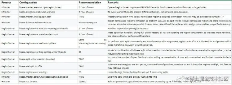 通过上述分析,可以配置如下参数来提升 HBase MTTR,尤其是在集群整体从崩溃中恢复的情况。