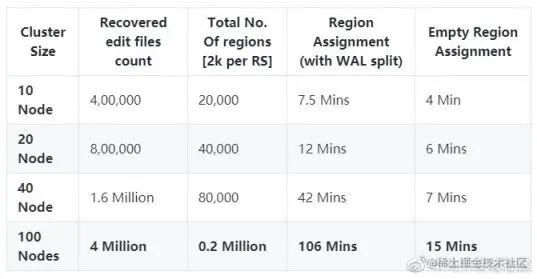 在 10 个 RegionServer 节点和 20 个 RegionServer 节点的测试中,RPC 调用分别花费了约 60 秒和 116 秒。对于更大的集群来说,批量分配无法一次成功。主要原因在于对 ZooKeeper 进行大量的读写操作和 RPC 调用,用来创建 OFFLINE ZNode 节点,创建正在恢复的 Region ZNode 节点信息等。