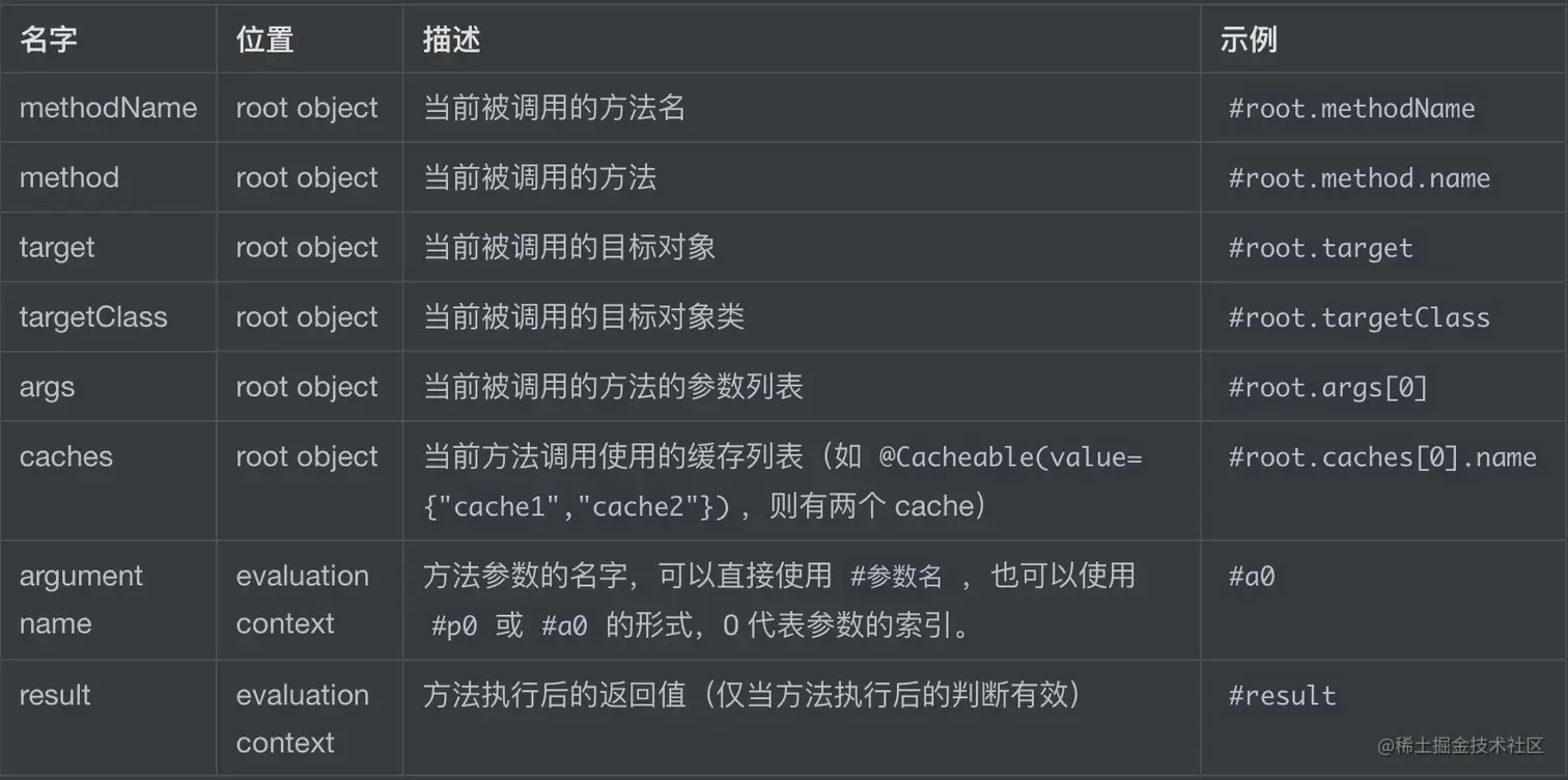 | caches | root对象 | 当前方法调用使用的缓存列表 | #root.caches[0].name |