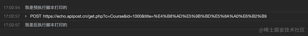 如下图所示(控制台打印),预执行在请求发送前执行,请求结束后,后执行脚本执行: