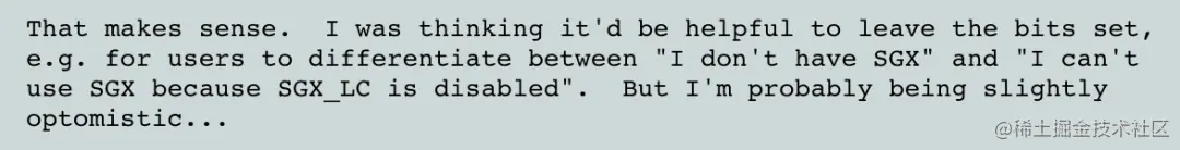 “即使MSR_IA32_SGXLEPUBKEYHASH不可写,但我们依旧保留其他SGX cpu feature flag,好让用户明白到底是我的系统不支持SGX硬件能力,还是因为缺少FLC功能导致无法运行普通的enclave,现在看起来可能是我想多了。” 关于Sean的这个结论,需要这样理解:虽然在不支持FLC或禁用FLC的平台上仍旧能够运,debug级的普通enclave,但是debug级的enclave是能够被sgx-gdb通过特殊的enclave debug指令访问到enclave中的敏感数据的,因此debug级的enclave不适合于生产环境;要运行不能被debug的产品级enclave,就必须要遵守Intel的Launch Enclave的授权策略,但这需要实施一些对常人来说不具可实施性的操作,这与一般用户想简单地就能运行普通enclave的需求确实相悖,因此大多数情况下,不支持FLC或禁用FLC就等价于用户无法运行普通enclave,而cpu feature flag可以反映出原因。
