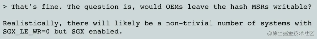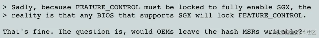 作者Sean应该是知道自己说错话了,没有回复这个问题;而Borislav此刻只想要一个东西:MSR_IA32_SGXLEPUBKEYHASH{0, 1, 2, 3}这四个MSR寄存器对内核来说必须可写!!!!