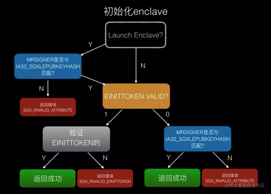 (上面的流程图是对Intel SDM手册中关于EINIT指令在微架构层的执行流程进行的总结;其中Launch Enclave验证两次IA32_SGXLEPUBKEYHASH的逻辑应该是冗余的,但我们还是按照原始流程的逻辑把它给完整地画出来了)
