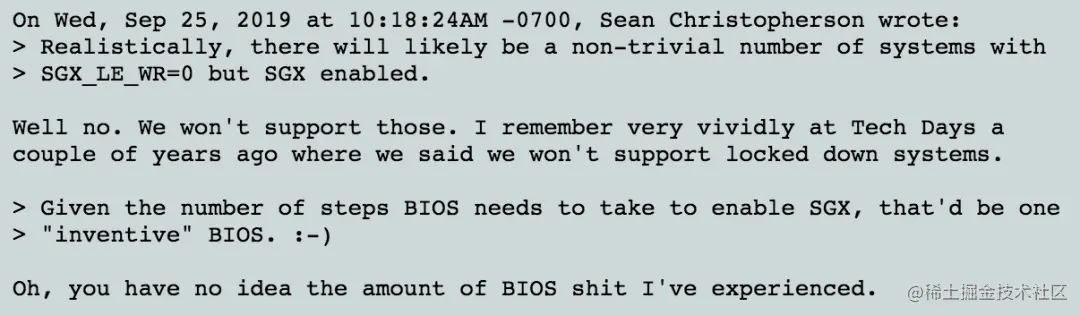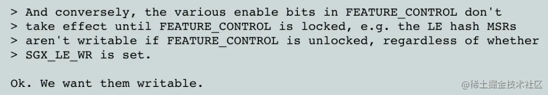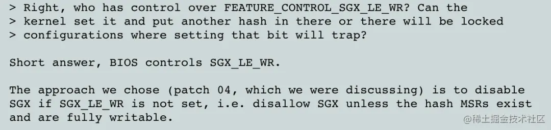 “内核不会对某种被锁定的配置提供支持,因为这夺走了内核(对启动enclave)的启动控制权。”结合前面关于FLC的技术原理讲解,这里的锁定指的就是如果BIOS锁死了IA32_SGXLEPUBKEYHASH,那么普通enclave的运行方式就要被Intel的Launch Enclave的授权策略所控制。这段描述引起了Reviewer Borislav的警觉,并给出了硬核回复:如果FEATURE_CONTROL_SGX_LE_WR位决定了IA32_SGXLEPUBKEYHASH是否被锁死,那么谁控制的FEATURE_CONTROL_SGX_LE_WR位?内核能够控制吗?我可不想让该死的BIOS去控制,真出点啥问题我们自己能搞定,用不着看OEM的脸色。