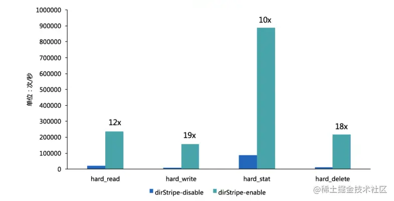 测试模拟了AI训练中,多个客户端并发访问同一个目录的场景。图中的结果是增加目录拆分前后的性能对比,从图中可以看到,无论是hard read, hard write,还是stat delete,目录拆分后,都有10倍以上的性能提升。