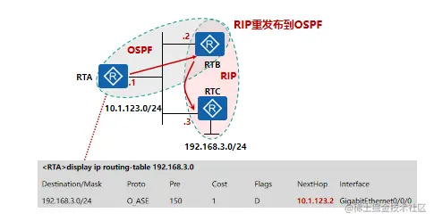 RTA和RTB之间运行OSPF RTB和RTC之间运行RIP 把RIP导入到OSPF进程中(RTB通过RIP学到192.168.3.0网络,但是RTA学不到3.0网络的路由,所以只能通过注入RIP学到3.0网络) 通过导入A学到的3.0的网络下一跳是10.1.123.2,但是A和C也在同一个局域网中所以产生了次优路径,Forwarding Address解决次优问题
