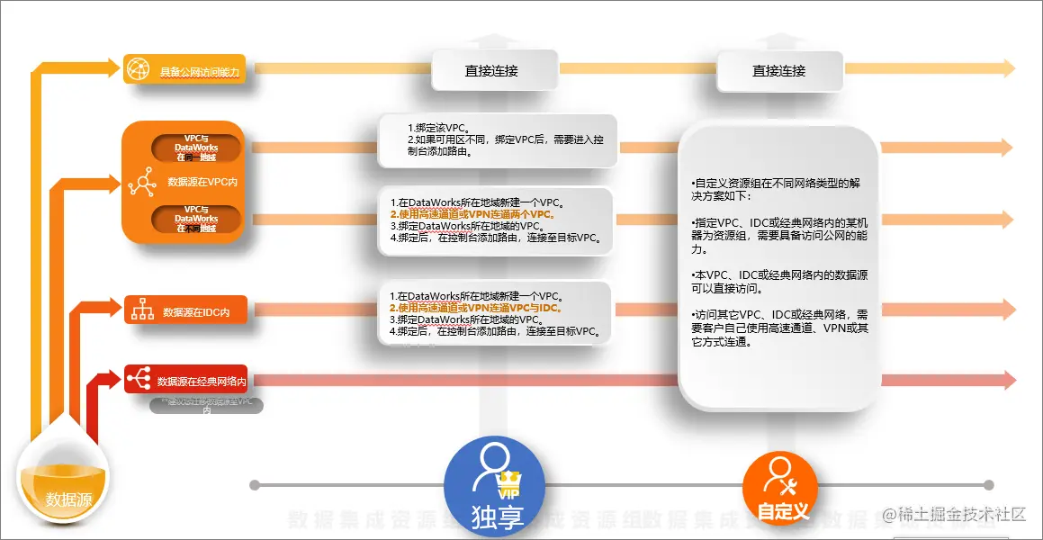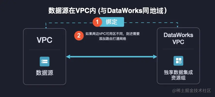 如果数据源在VPC网络中,且VPC和DataWorks在不同的地域中,那您需要为独享数据集成资源组绑定一个VPC,然后通过高速通道、VPN或其他网络连通产品连通资源组绑定的VPC与数据源所在的VPC。