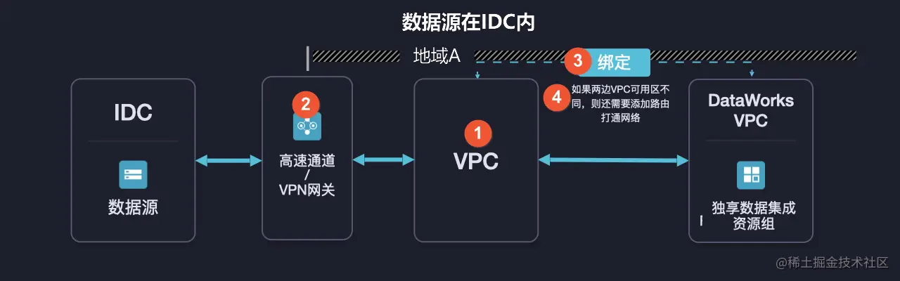 如果数据源在IDC内,与场景3:数据源在VPC中且与DataWorks不同地域的场景类似,您需要为独享数据集成资源组绑定一个VPC,然后通过高速通道、VPN或其他网络连通产品连通资源组绑定的VPC与数据源所在的VPC。