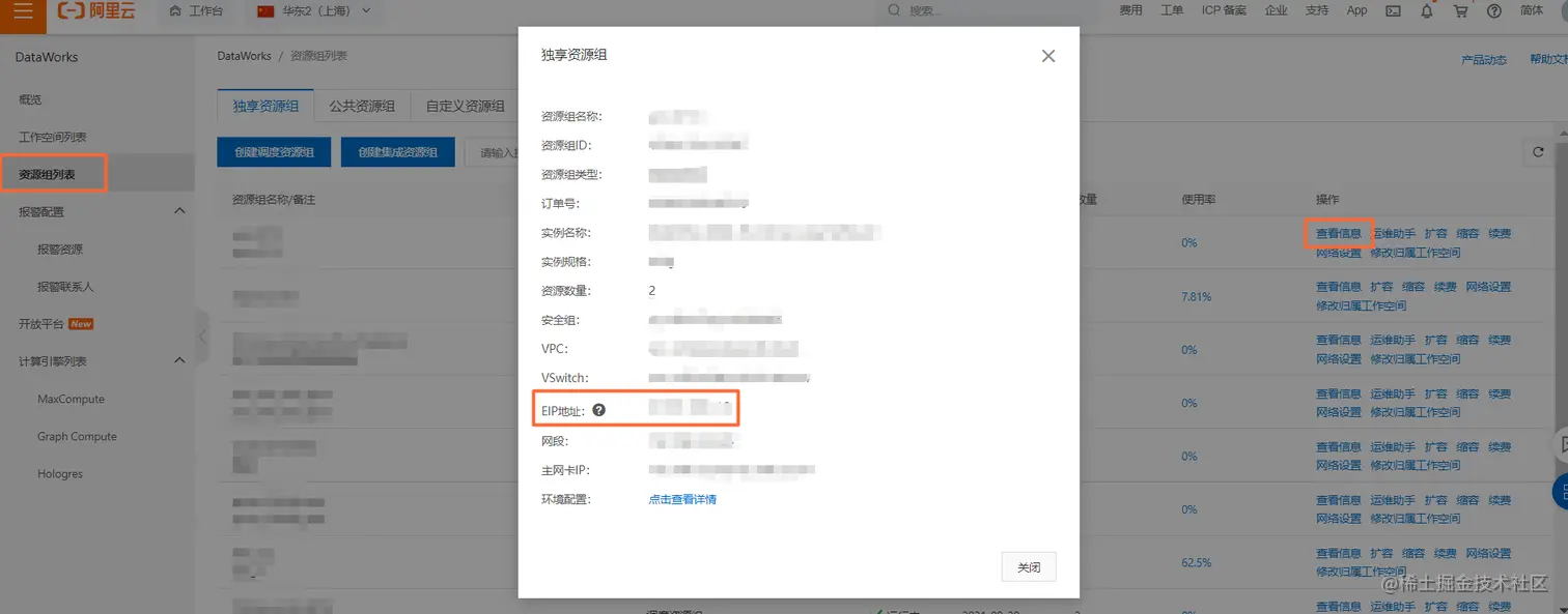 使用不同类型的数据集成资源组时,需要添加到数据源白名单中的IP地址不一致,详情可进入帮助中心查看,以下为您示例,使用独享数据集成资源组时,需要获取并添加到数据源白名单中的IP地址。