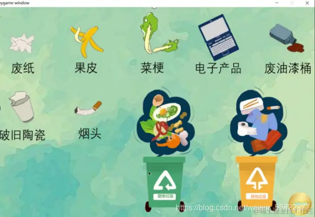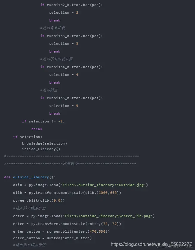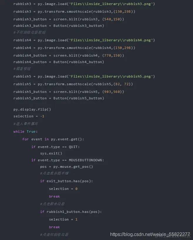 exits = py.image.load('Files\\inside_liberary\\exit.png') exits = py.transform.smoothscale(exits,(72,81)) exit_button = screen.blit(exits,(5, 560)) exit_button = Button(exit_button) #厨余垃圾按钮 rubbish1 = py.image.load('Files\\inside_liberary\\rubbish1.png') rubbish1 = py.transform.smoothscale(rubbish1,(150,298)) rubbish1_button = screen.blit(rubbish1, (80,150)) rubbish1_button = Button(rubbish1_button) #可回收垃圾按钮 rubbish2 = py.image.load('Files\\inside_liberary\\rubbish2.png') rubbish2 = py.transform.smoothscale(rubbish2,(150,298)) rubbish2_button = screen.blit(rubbish2, (310,150)) rubbish2_button = Button(rubbish2_button) #有害垃圾按钮 rubbish3 = py.image.load('Files\\inside_liberary\\rubbish3.png') rubbish3 = py.transform.smoothscale(rubbish3,(150,298)) rubbish3_button = screen.blit(rubbish3, (540,150)) rubbish3_button = Button(rubbish3_button) #不可回收垃圾按钮 rubbish4 = py.image.load('Files\\inside_liberary\\rubbish4.png') rubbish4 = py.transform.smoothscale(rubbish4,(150,298)) rubbish4_button = screen.blit(rubbish4, (770,150)) rubbish4_button = Button(rubbish4_button) #图鉴按钮 rubbish5 = py.image.load('Files\\inside_liberary\\rubbish5.png') rubbish5 = py.transform.smoothscale(rubbish5,(82, 72)) rubbish5_button = screen.blit(rubbish5, (903,560)) rubbish5_button = Button(rubbish5_button) py.display.flip() selection = -1