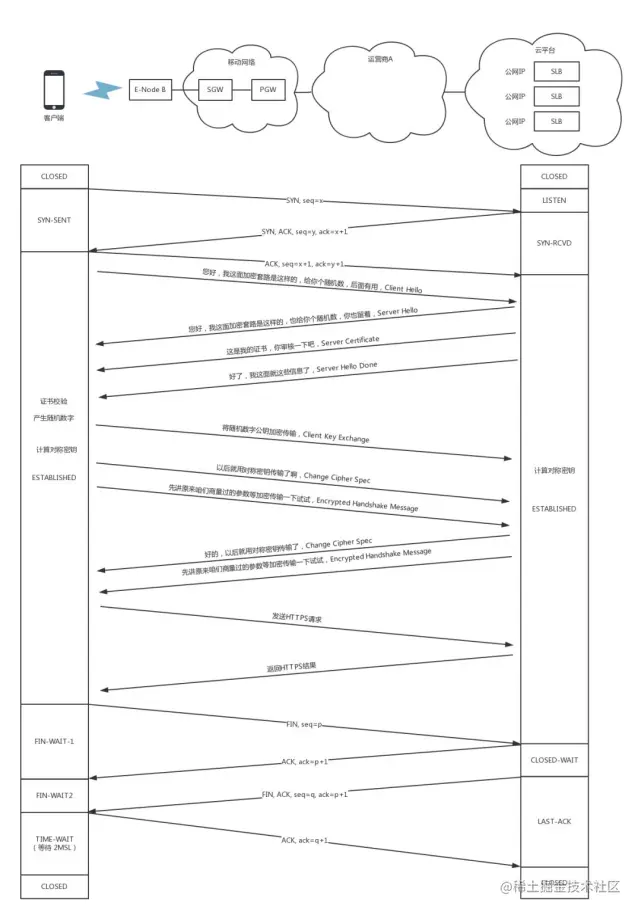HTTPS协议是基于TCP协议的,因而要先建立TCP的连接。在这个例子中,TCP的连接是从手机上的App和负载均衡器SLB之间的。也就是唐僧和金顶大仙之间,到了金顶大仙,就不怕了,会指引到佛祖那里的。
