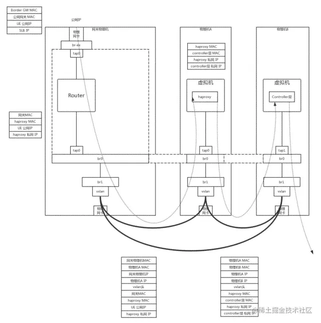 当然为了承载比较大的吞吐量,虚拟网关节点会有多个,物理网络会将流量分发到不同的虚拟网关节点。同样HAProxy也会是一个大的集群,虚拟网关会选择某个负载均衡节点,将某个请求分发给它,负载均衡之后是Controller层,也是部署在虚拟机里面的。