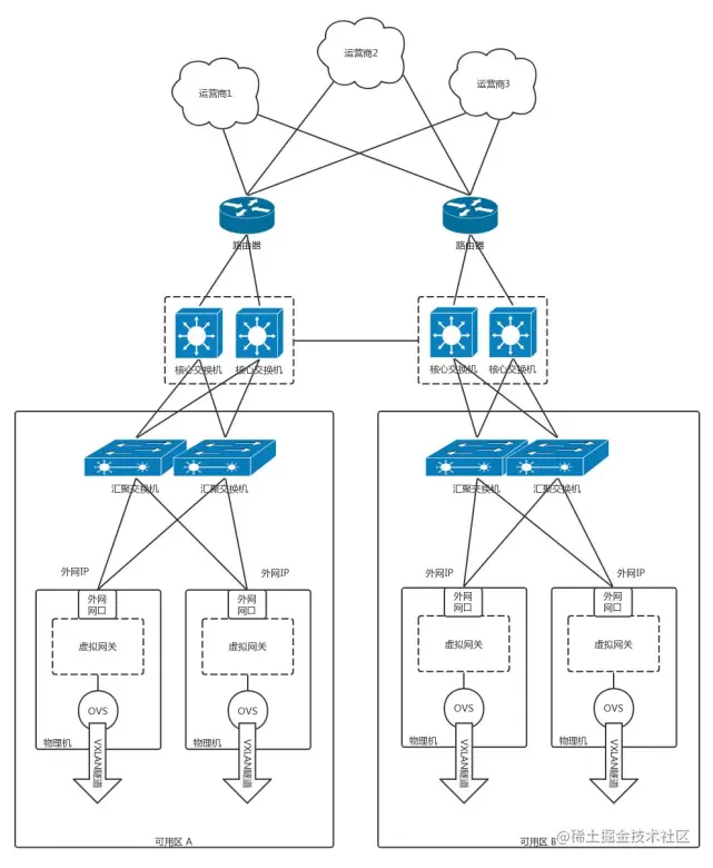 外网IP是放在虚拟网关的外网网口上的,这个IP如何让全世界知道呢?在核心交换外面是安全设备,然后就是边界路由器。边界路由器会和多个运营商连接,从而每个运营商都能够访问到这个网站。边界路由器可以通过BGP协议,将自己数据中心里面的外网IP向外广播,也就是告诉全世界,如果要访问这些外网IP,都来我这里。