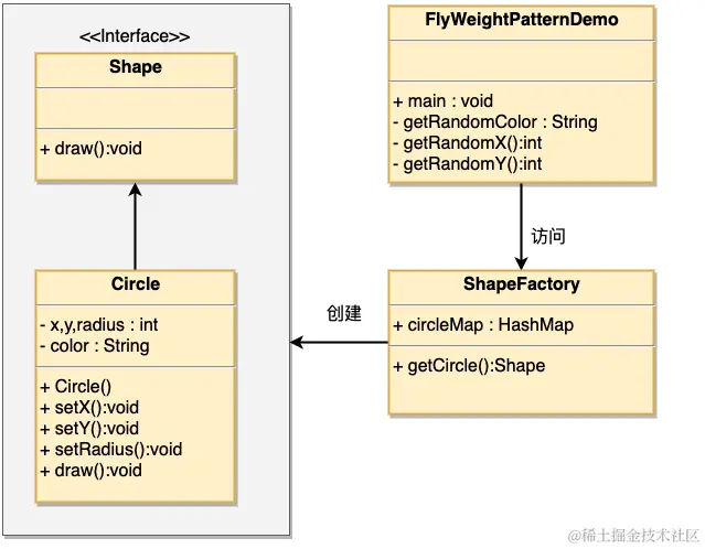ShapeFactory 有一个 Circle 的 HashMap,其中键名为 Circle 对象的颜色。无论何时接收到请求,都会创建一个特定颜色的圆。ShapeFactory 检查它的 HashMap 中的 Circle 对象,如果找到 Circle 对象,则返回该对象,否则将创建一个存储在 hashmap 中以备后续使用的新对象,并把该对象返回到客户端。