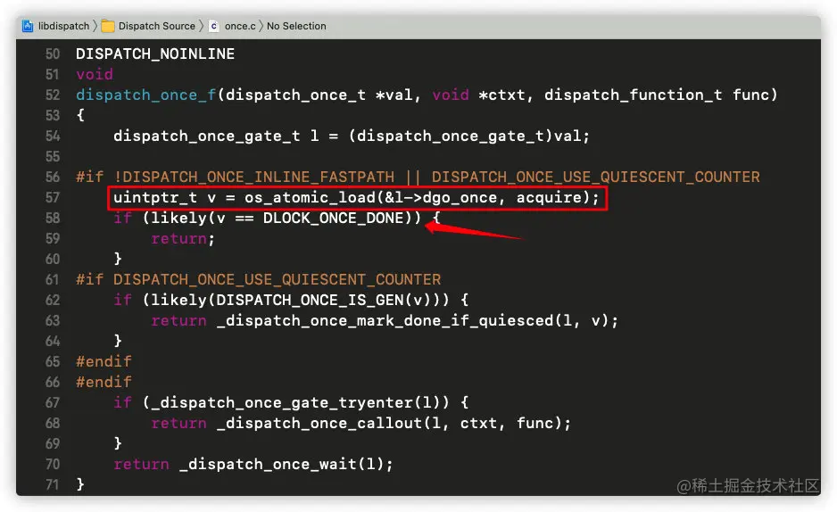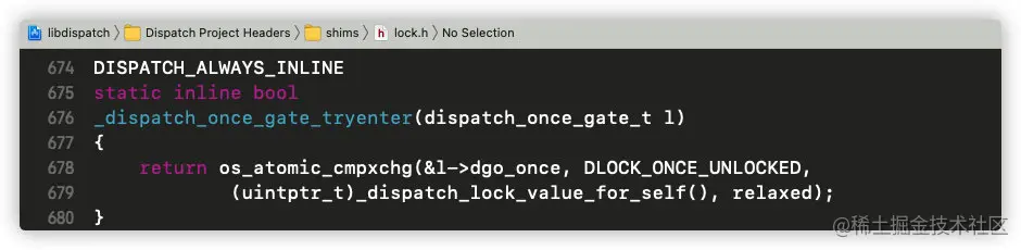 os_atomic_cmpxchg进行原子操作,进行锁的处理,说明其实有线程控制的;_dispatch_lock_value_for_self当前队列中的线程空间的锁,防止多线程(单例类的线程安全问题);