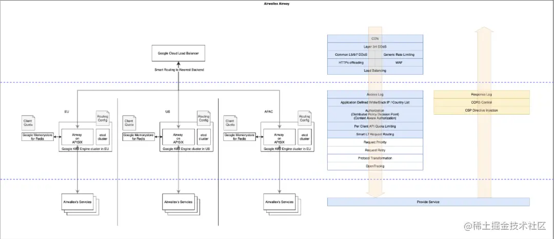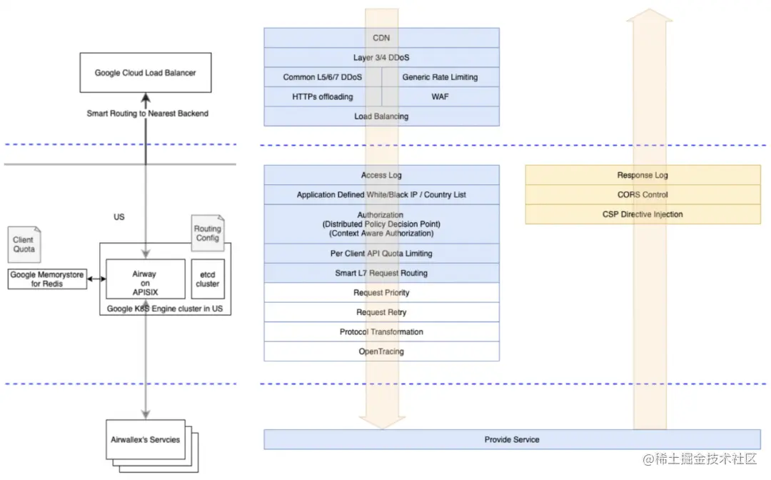 李杨: 我们把 Apache APISIX 用作微服务网关模式的核心组件,它被部署在网络边缘,为所有进入 Airwallex 空中云汇的流量提供通用网关功能,解决的问题包括: