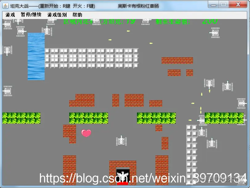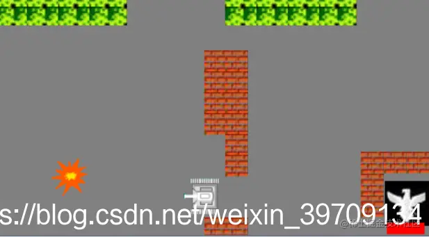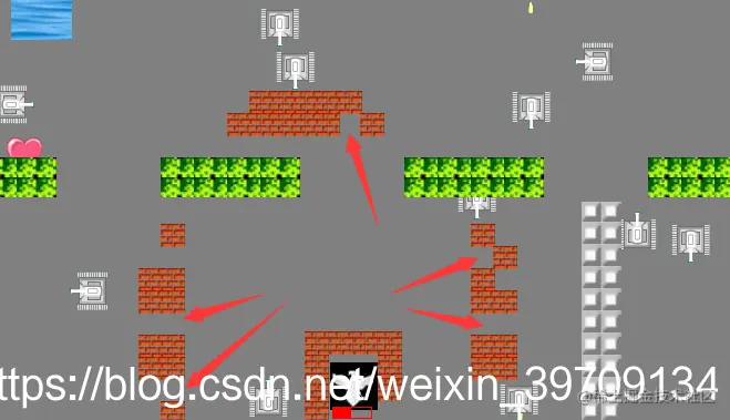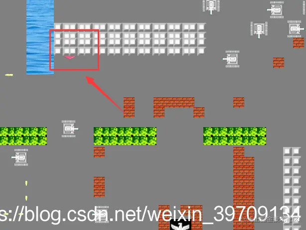 2. 界面中包含坦克,树,河流,阻挡墙和游戏用户所要保护的“家”。