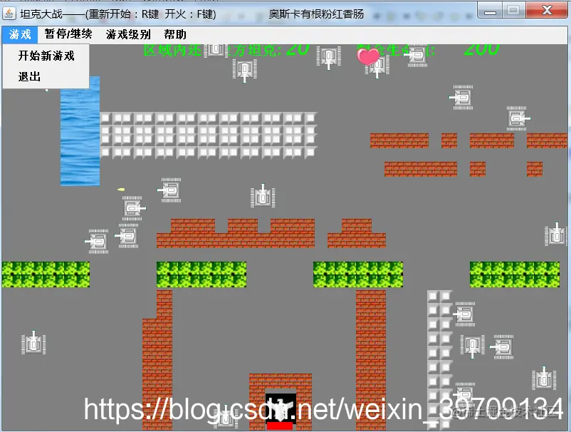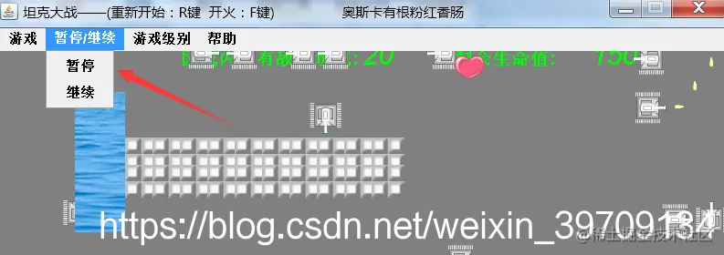 菜单功能包括游戏的重新开始,暂停,退出等。这些功能的用户界面放在了TankClient的构造方法里,用到的是面板类和相应的监听功能,实现出来很简单。