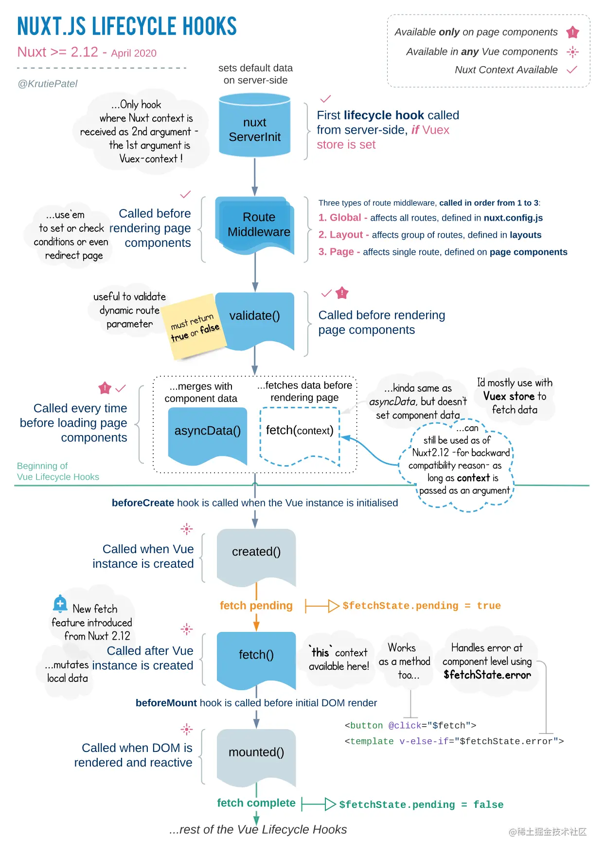通过上面的流程图可以看出,当一个客户端请求进入的时候,服务端有通过 nuxtServerInit 这个命令执行在 store 的 action 中,在这里接收到客户端请求的时候,可以将一些客户端信息存储到 store 中,比如项目中的用户信息。nuxtServerInit 钩子只有 store 目录下的 index.js 有效,其他模块文件是无法调用的。