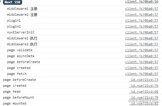 首先执行的是中间件以及插件的注册 =》状态管理器 store/index.js/action/nuxtServerInit =》全局配置的 middleware =》 页面 middleware =》页面 validate 校验 =》 异步数据 asyncData 执行 =》 beforeCreate =》 created =》 fetch 填充 store =》 head 设置头部 =》 beforeMount =》mounted