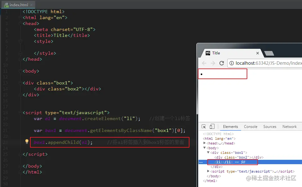 我们可以看到,li标签确实被插入到了box1标签的里面,和box2并列了。