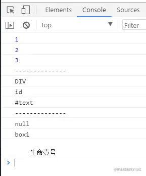 var element = document.getElementById("box1"); //获取元素节点(标签) var attribute = element.getAttributeNode("id"); //获取box1的属性节点 var txt = element.firstChild; //获取box1的文本节点 //获取nodeType console.log(element.nodeType); //1 console.log(attribute.nodeType); //2 console.log(txt.nodeType); //3 console.log("--------------"); //获取nodeName console.log(element.nodeName); //DIV console.log(attribute.nodeName); //id console.log(txt.nodeName); //#text console.log("--------------"); //获取nodeValue console.log(element.nodeValue); //null console.log(attribute.nodeValue); //box1 console.log(txt.nodeValue); //生命壹号