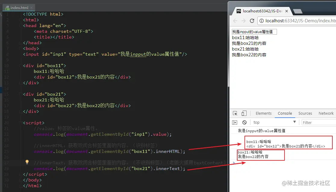 如果我们想获取innerHTML和innerText里的内容,看看会如何:(innerHTML会获取到标签本身,而innerText则不会)