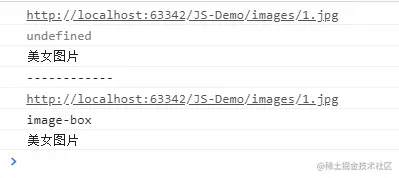 <body><img src="images/1.jpg" class="image-box" title="美女图片" alt="地铁一瞥" id="a1"><script type="text/javascript"> var myNode = document.getElementsByTagName("img")[0]; console.log(myNode.src); console.log(myNode.className); //注意,是className,不是class console.log(myNode.title); console.log("------------"); console.log(myNode["src"]); console.log(myNode["className"]); //注意,是className,不是class console.log(myNode["title"]);</script></body>