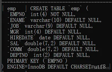 注意 : 其中注意 : 其中ENGINE=InnoDB代表引擎 DEFAULT CHARSET=utf8代表字符集是哪个类型的。