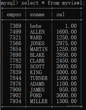 update myview1 set ename='hehe',sal=1 where empno = 7369;