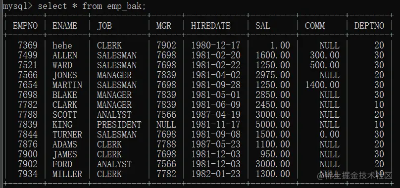第五步 : 查看此时emp_bak中的数据