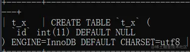 Create TABLE t_x ( id int(11) DEFAULT NULL ) ENGINE=InnoDB DEFAULT CHARSET=utf8;