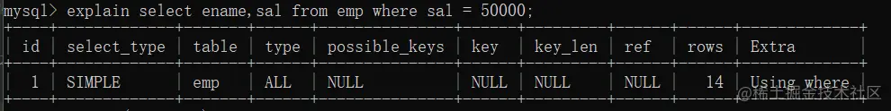 注意 : 此时还没有给sal字段添加索引,type字段值为ALL,代表需要查询的是所有sal的数据,rows为14代表查询的数据为14条。